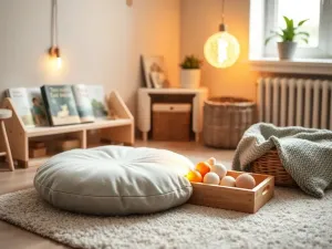 Przydaje się też niewielki „kącik wyciszenia”. Kilka miękkich poduszek, koc, może namiot tipi lub kartonowy domek. To przestrzeń, gdzie dziecko po intensywnej zabawie w pianie czy na torze przeszkód może się przytulić, schować i odpocząć w półmroku.